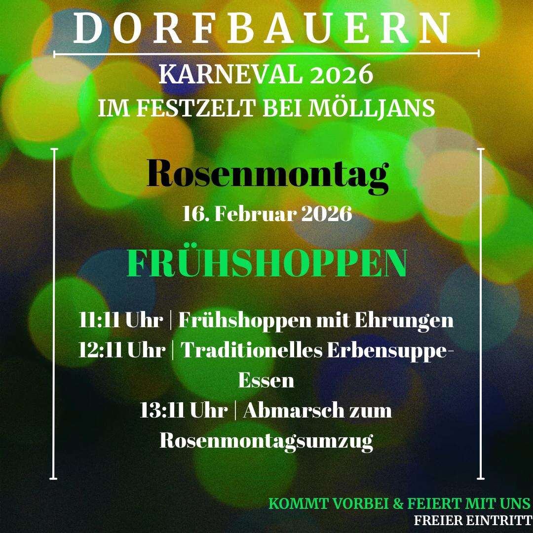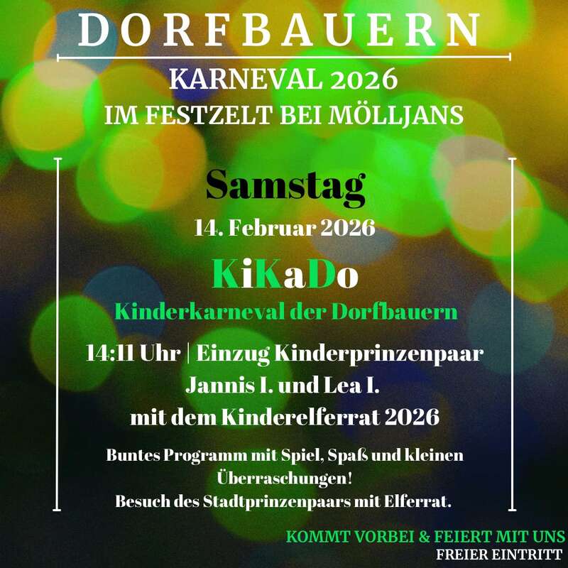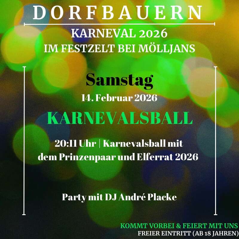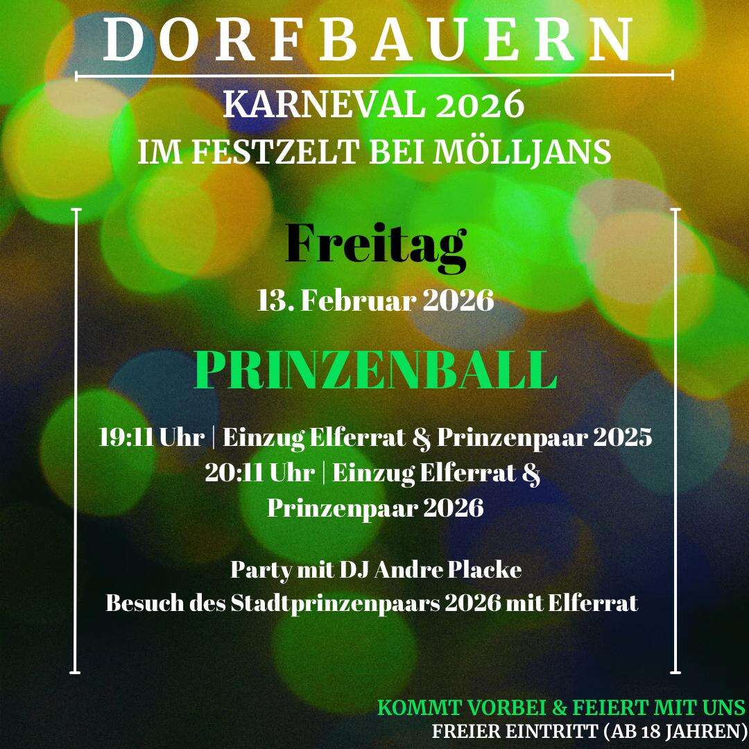 19:11 Uhr Einzug Elferrat und Prinzenpaar 2025. 20:11 Uhr Einzug Elferrat und Prinzenpaar 2026. Musik und Tanz mit DJ André Placke.
