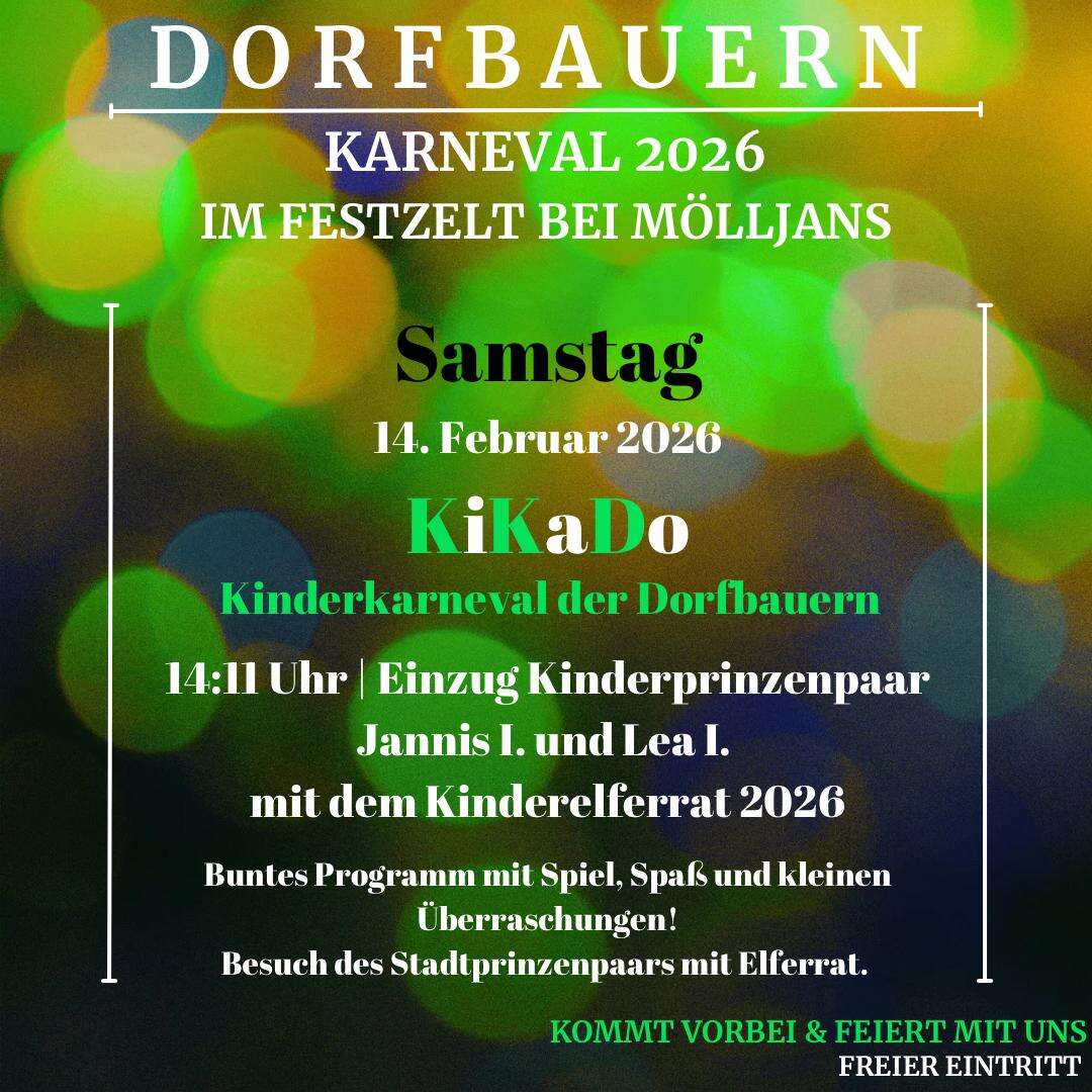 14:11 Uhr Einzug des Kinderelferrates und Kinderprinzenpaar 2026. Es folgt ein buntes Programm mit Spiel und Spaß. Es besucht uns ebenfalls der Stadtelferrat.
